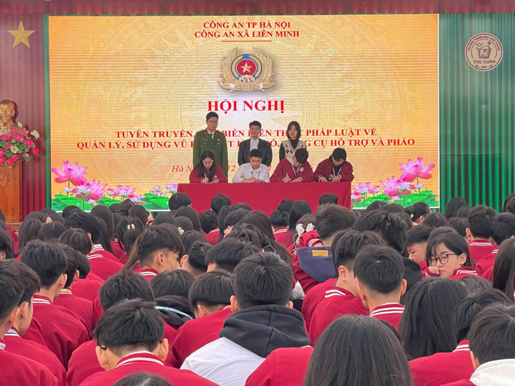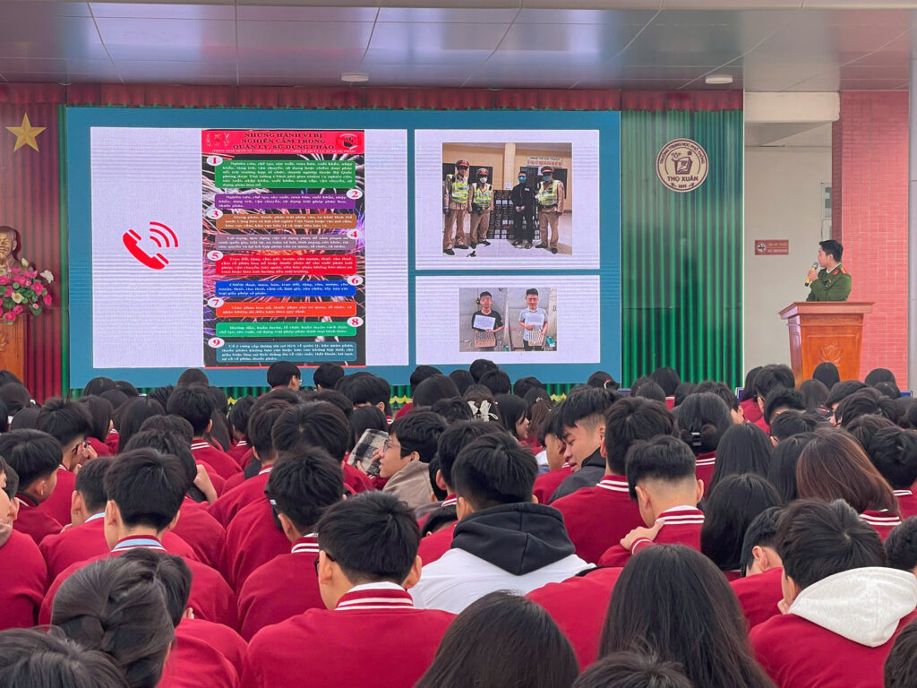 Sáng 12/01/2025, trường THPT Thọ Xuân phối hợp với Công an xã Liên Minh tổ chức tuyên truyền, phổ biến kiến thức pháp luật về quản lý, sử dụng vũ khí, vật liệu nổ, công cụ hỗ trợ và pháo cho cán bộ, giáo viên và học sinh toàn trường.