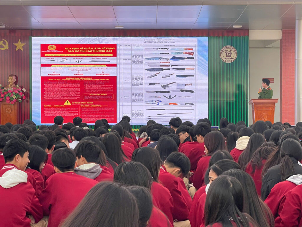 Sáng 12/01/2025, trường THPT Thọ Xuân phối hợp với Công an xã Liên Minh tổ chức tuyên truyền, phổ biến kiến thức pháp luật về quản lý, sử dụng vũ khí, vật liệu nổ, công cụ hỗ trợ và pháo cho cán bộ, giáo viên và học sinh toàn trường.